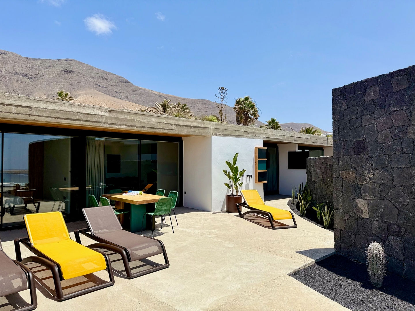 El exterior está dominado por los materiales clásicos utilizados en la isla, piedra de lava, superficies encaladas en blanco, madera y detalles en el verde de Lanzarote. Estos materiales también se utilizan en la construcción de los espacios interiores, pero en el diseño arquitectónico interior se ha hecho hincapié en materiales sensuales y coloridos que permitan al usuario sumergirse en un mundo de color diferente en cada habitación.
