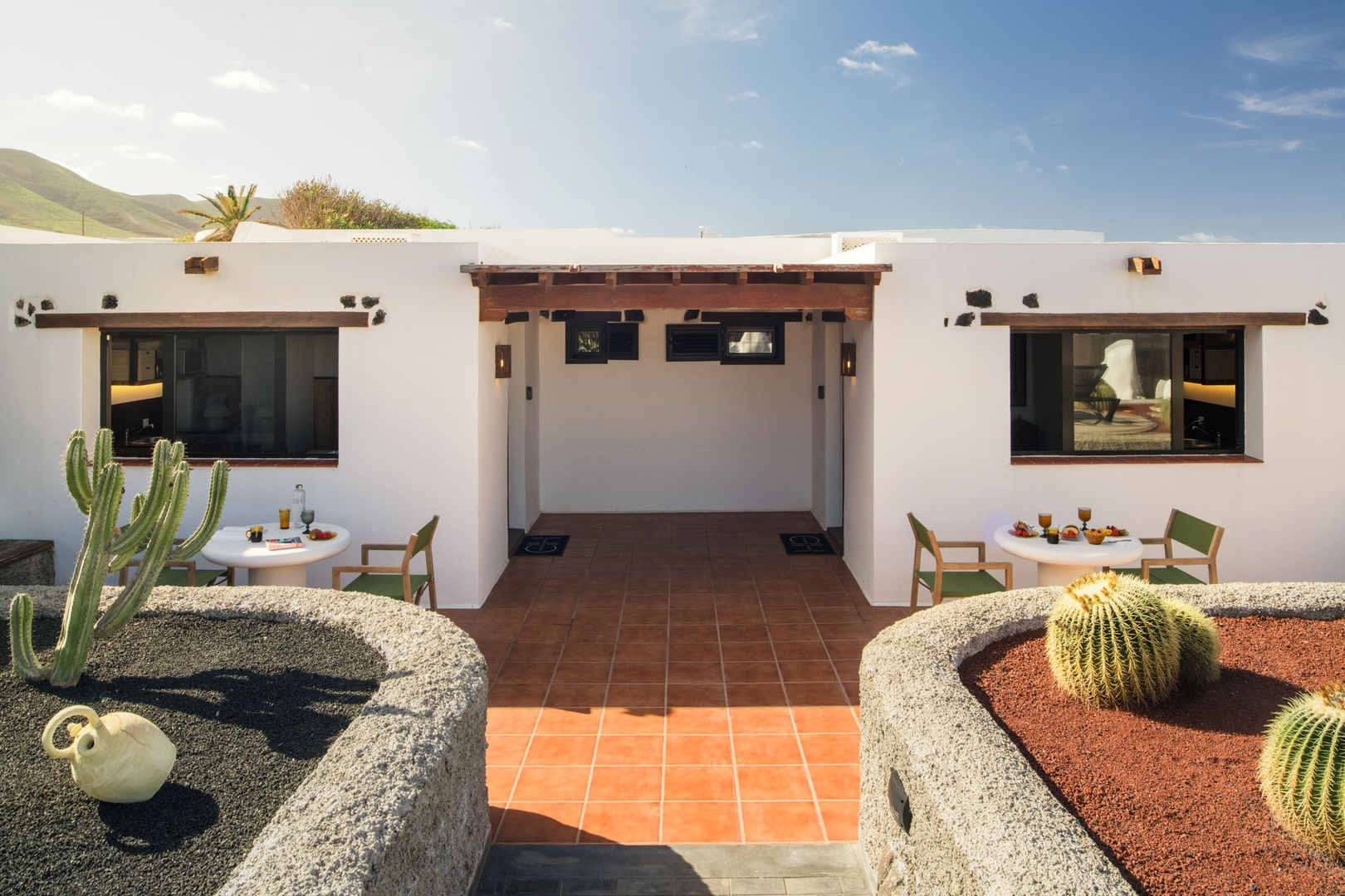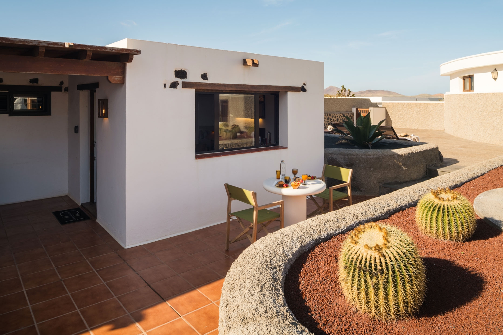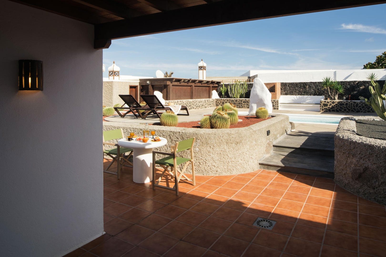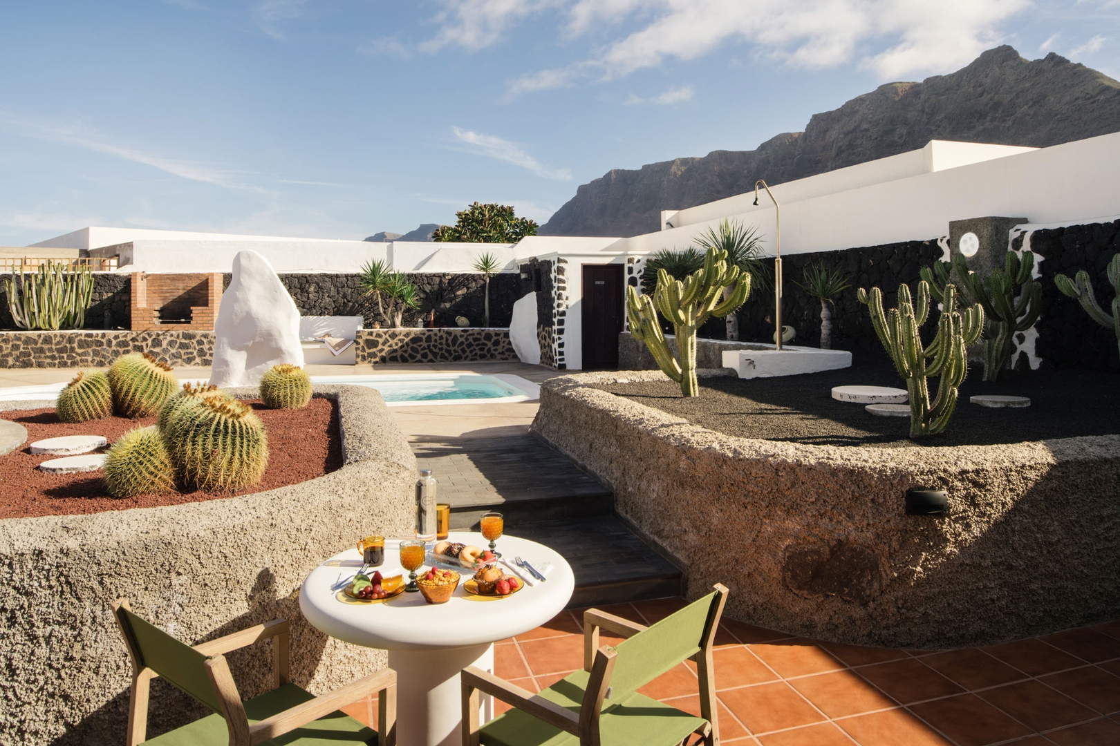 Cada detalle ha sido cuidadosamente pensado para disfrutar del entorno: una piscina climatizada, una agradable zona de tumbonas para relajarse al sol y terrazas privadas con vistas únicas a Famara, perfectas para compartir comidas y cenas mientras el paisaje marca el ritmo del día.