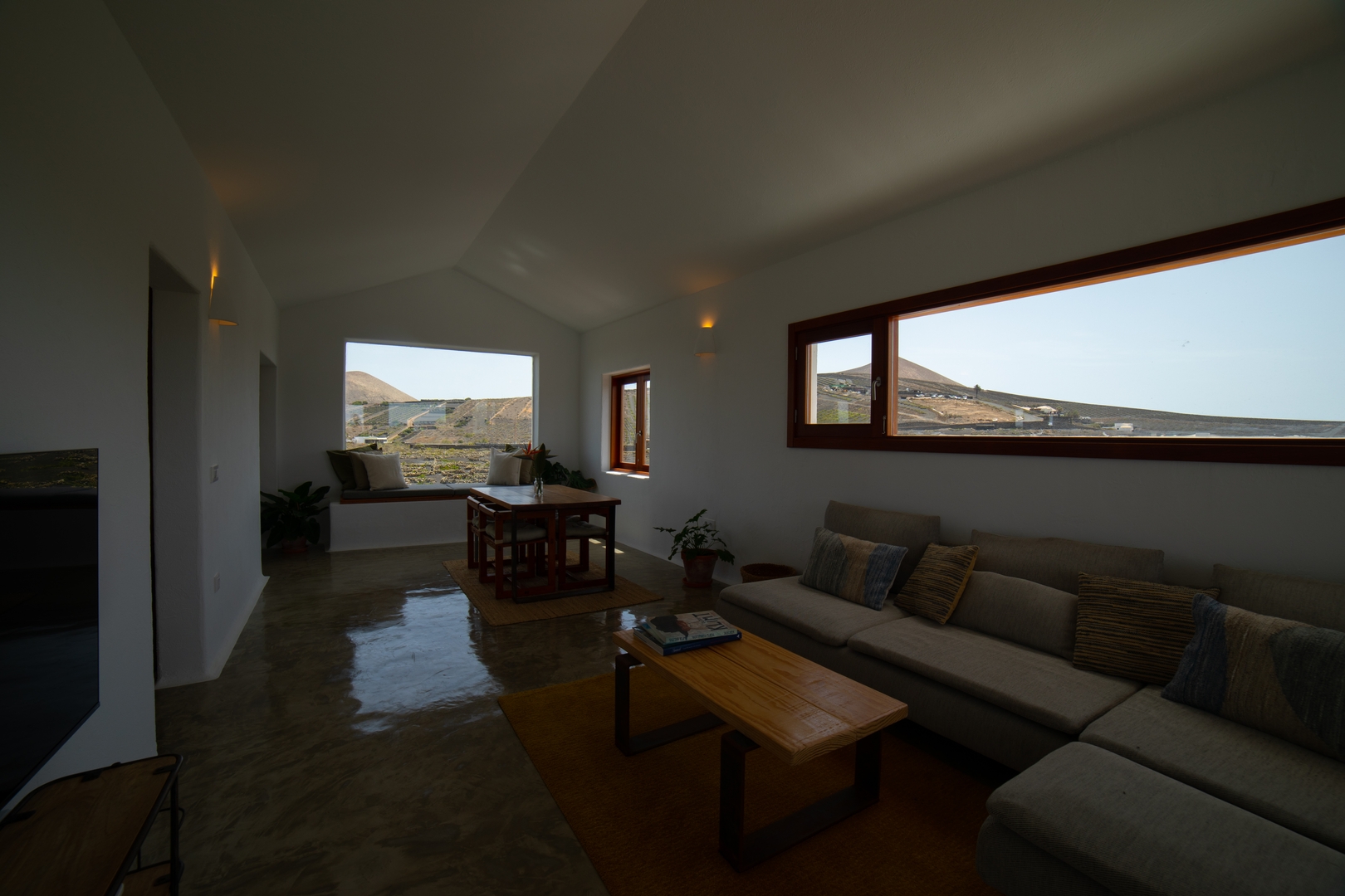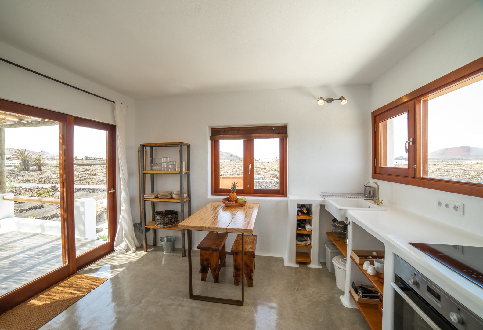 En el interior, la casa respira sencillez y armonía. Materiales nobles, madera natural y tonos neutros crean una atmósfera luminosa y serena. La cocina completamente equipada, con horno, tostadora, cafetera, nevera, menaje y utensilios completos, se abre al comedor y al salón, formando un espacio cómodo y funcional, pensado para disfrutar sin prisas. Las grandes ventanas conectan constantemente con el entorno, permitiendo que la luz y el paisaje formen parte de la experiencia.