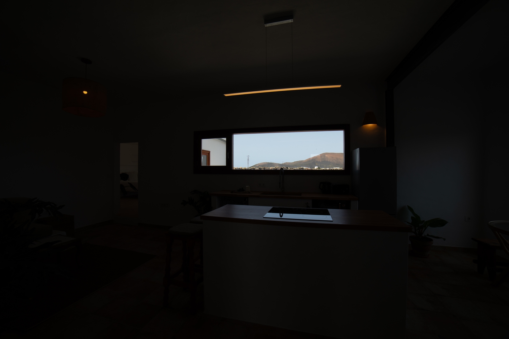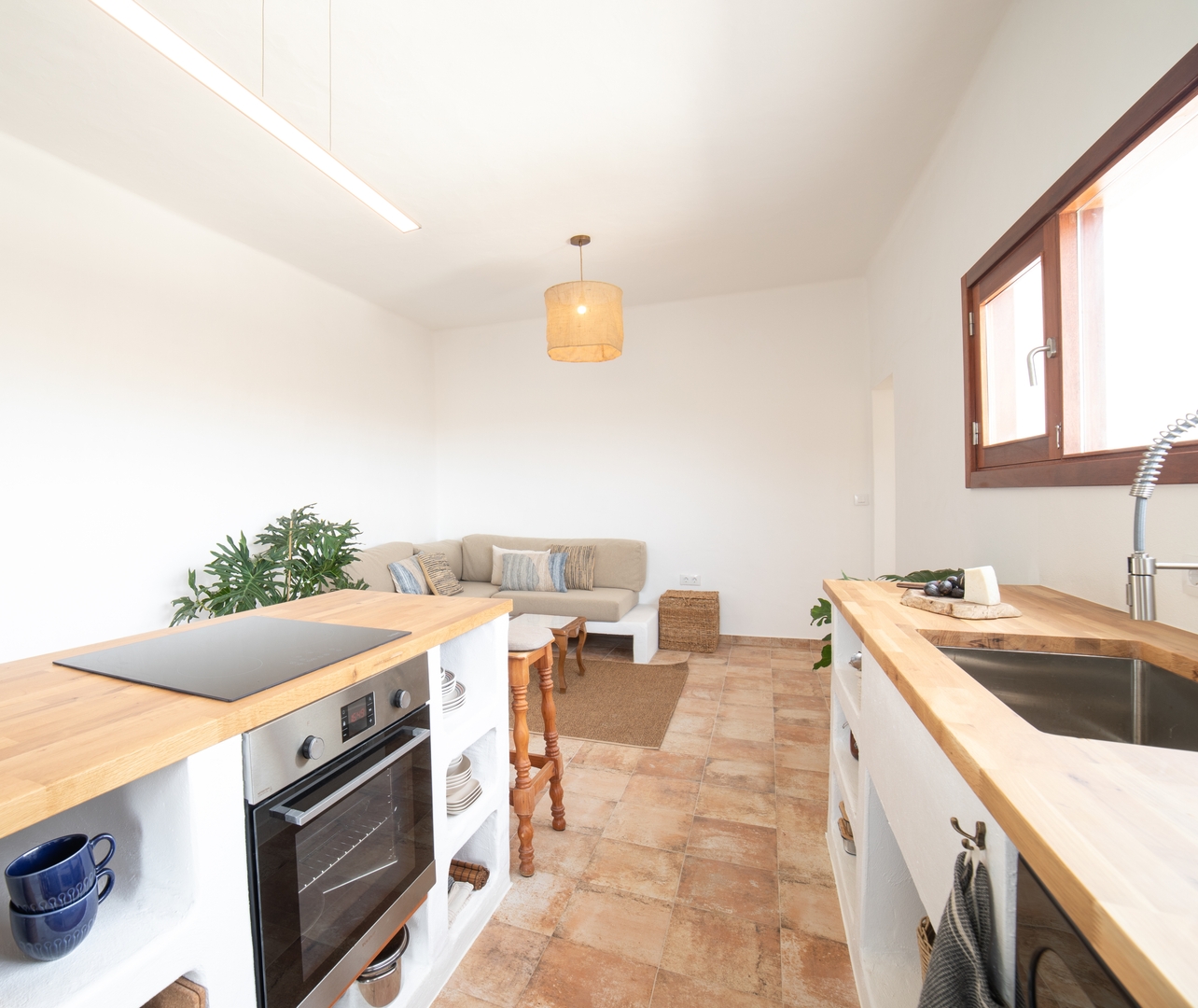 En el interior, la casa respira sencillez y armonía. Materiales nobles, madera natural y tonos neutros crean una atmósfera luminosa y serena. La cocina completamente equipada, con horno, tostadora, cafetera, nevera, menaje y utensilios completos, se abre al comedor y al salón, formando un espacio cómodo y funcional, pensado para disfrutar sin prisas. Las grandes ventanas conectan constantemente con el entorno, permitiendo que la luz y el paisaje formen parte de la experiencia.